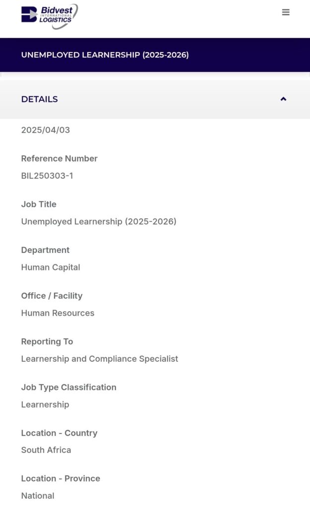 Job Title: Unemployed Learnership (2025-2026)