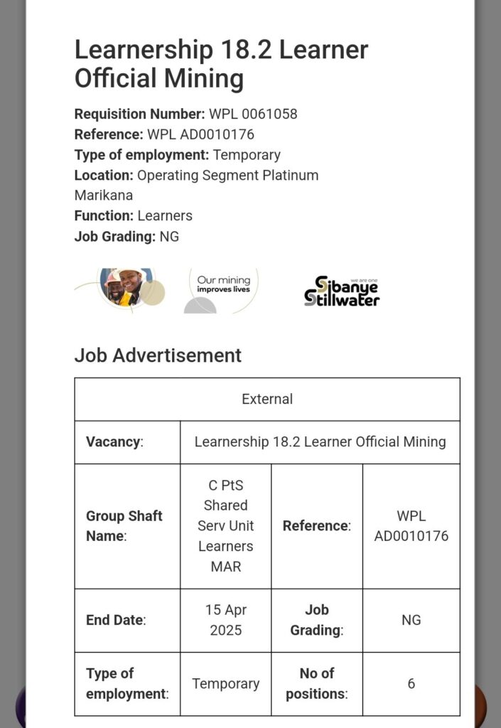 External Vacancy: Learnership 18.2 Learner Official Mining Group Shaft Name: C PtS Shared Serv Unit Learners MAR Reference: WPL AD0010176 End Date: 15 Apr 2025 Job Grading: NG Type of Employment: Temporary No of Positions: 6