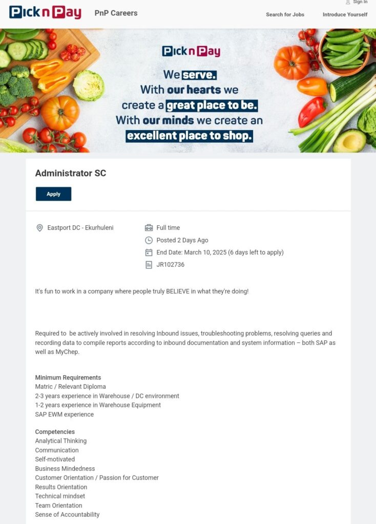 At Pick n Pay, our strength lies in our people. We strive to be the employer of choice, attracting and retaining the best talent in the industry. We create a work environment that fosters growth, celebrates achievements, and values individual contributions. Here, your work will be meaningful, recognized, and rewarded.