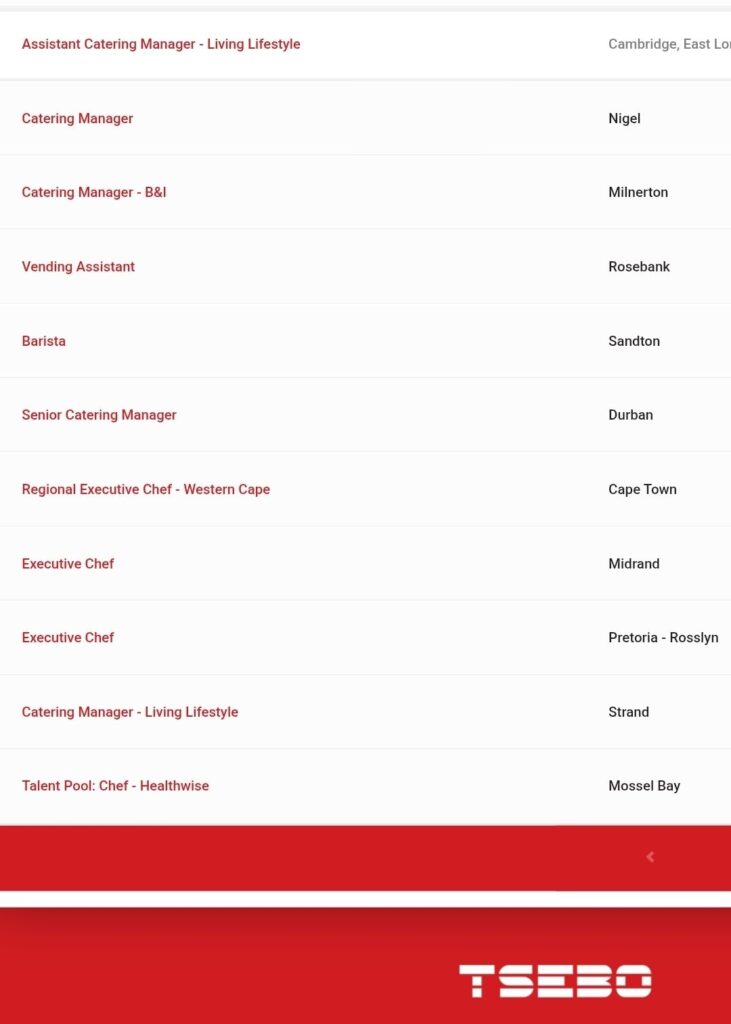 With our extensive footprint across Africa, the Middle East and progressive growth strategy, Tsebo can offer you a wide range of exciting and challenging job opportunities, as well as career development opportunities and very importantly, stable employment in a caring working milieu.